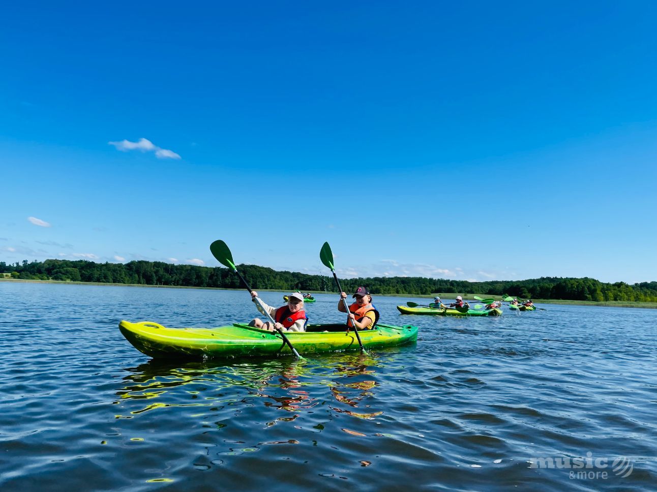 - zajęcia kajakowe na Jeziorze Bęskim (nauka pływania w kajaku, zasady bezpieczeństwa, zabawy i wyścigi kajakowe)